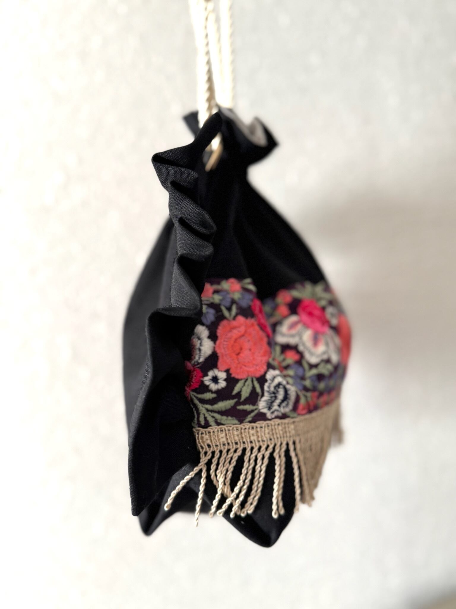 ◣華やかで目を引くインド刺繍リボンを使った巾着ショルダーバック◥