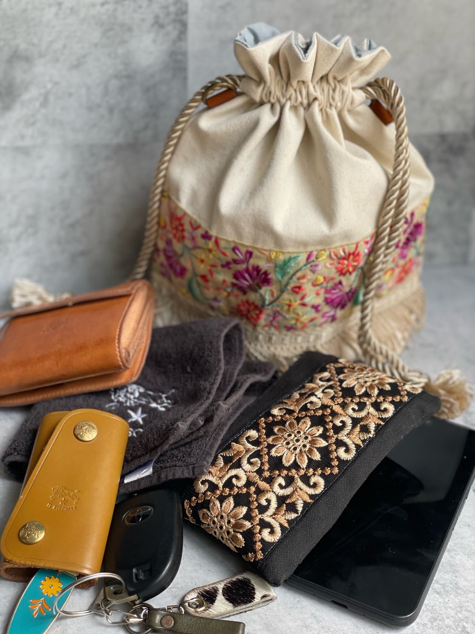 ◣華やかで目を引くインド刺繍リボンを使った巾着ショルダーバック◥
