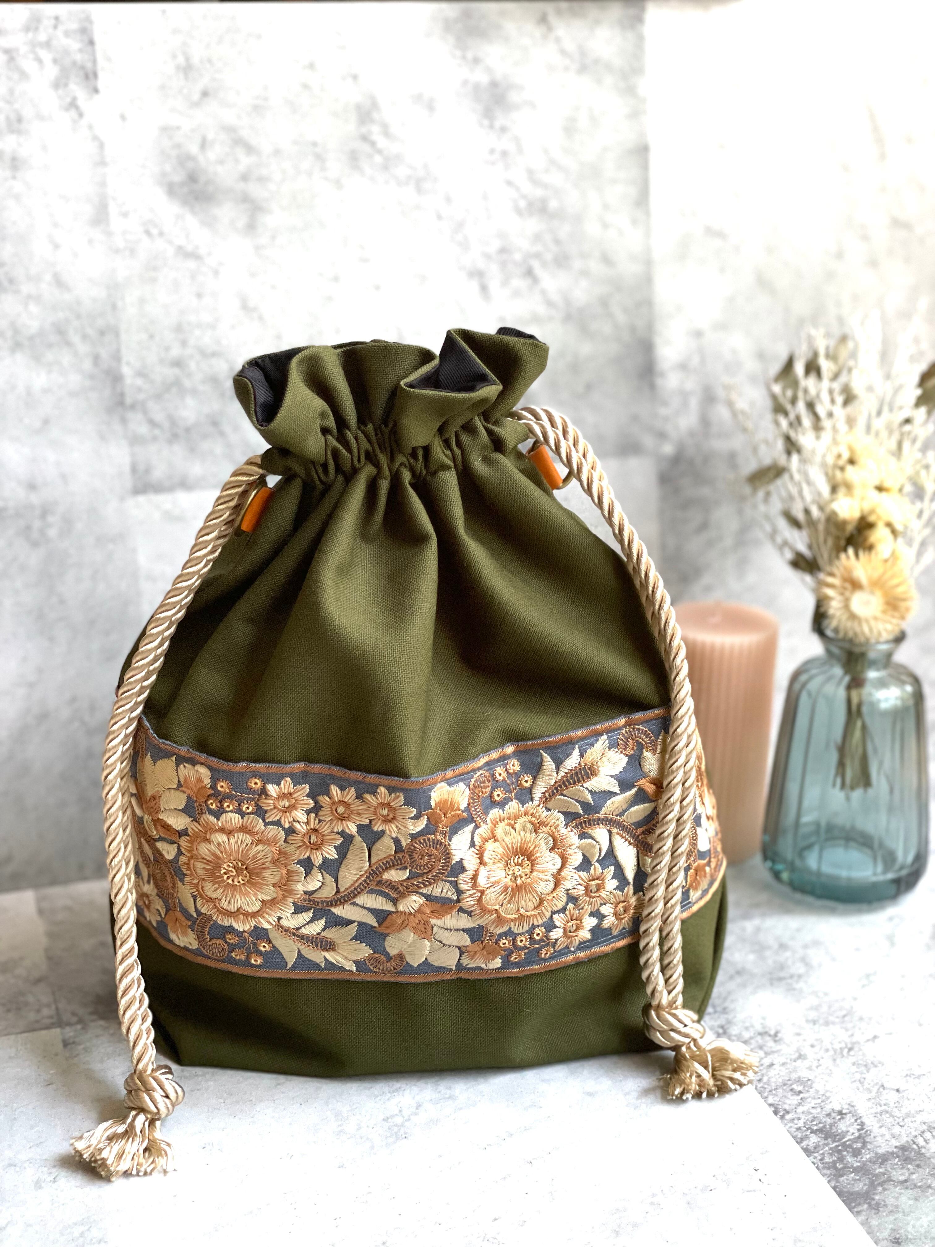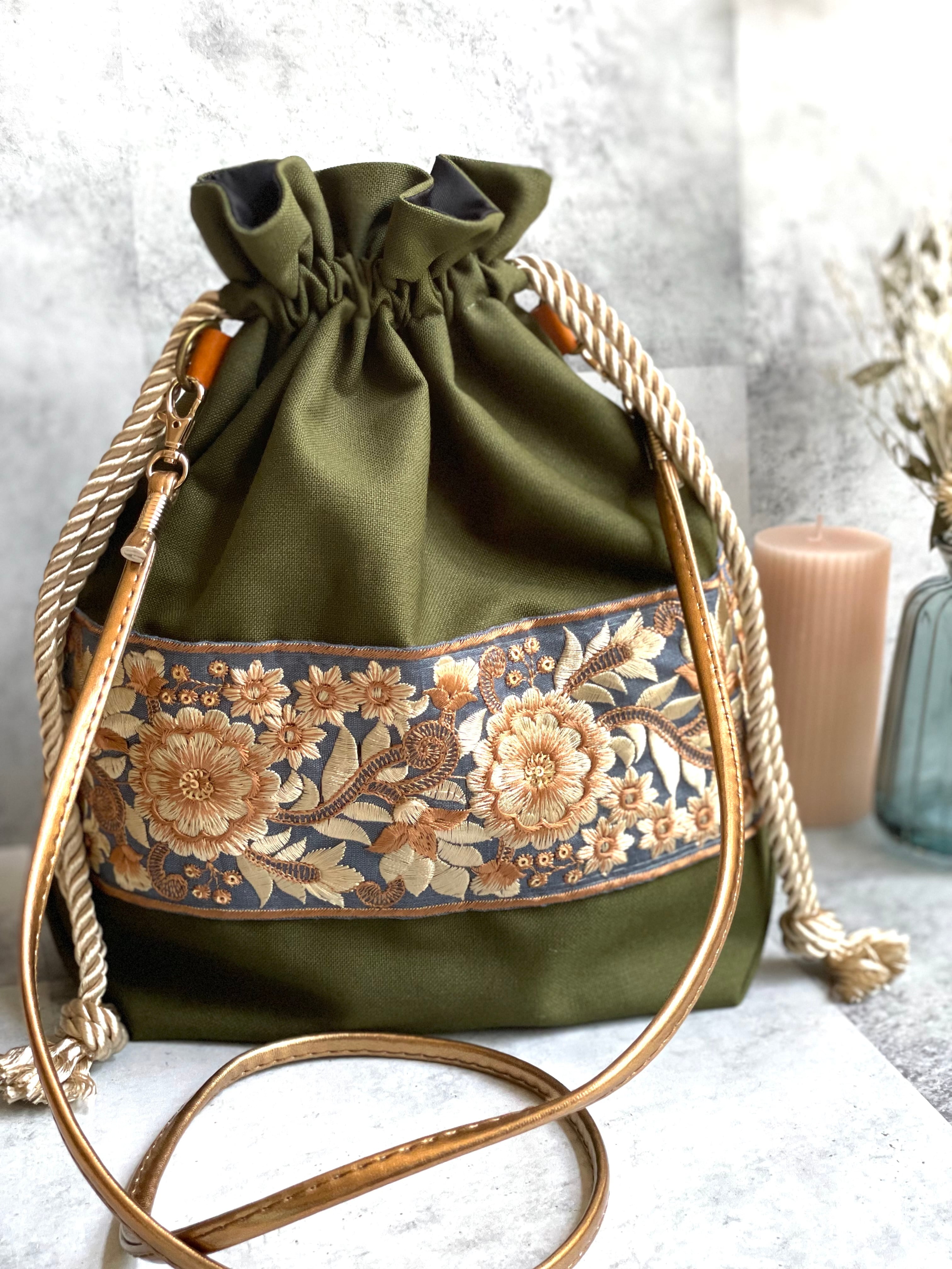 ◣華やかで目を引くインド刺繍リボンを使った巾着ショルダーバック◥