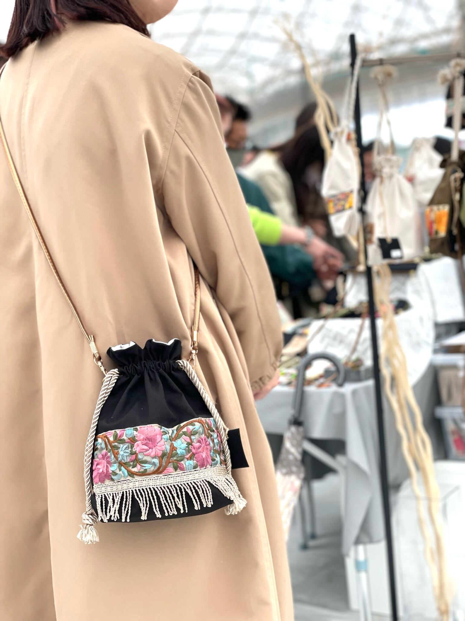 ◣華やかで目を引くインド刺繍リボンを使った巾着ショルダーバック◥
