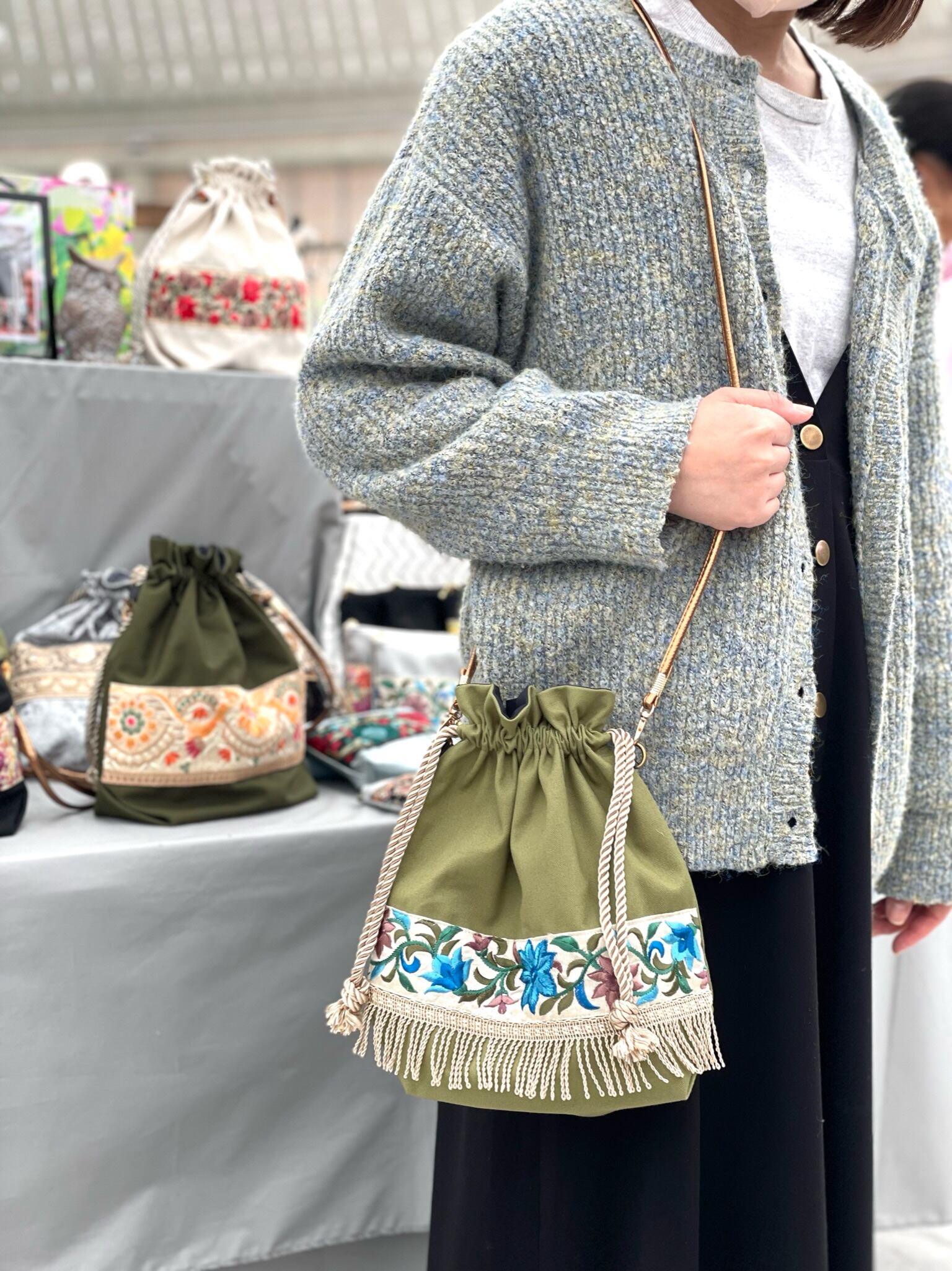 ◣華やかで目を引くインド刺繍リボンを使った巾着ショルダーバック◥