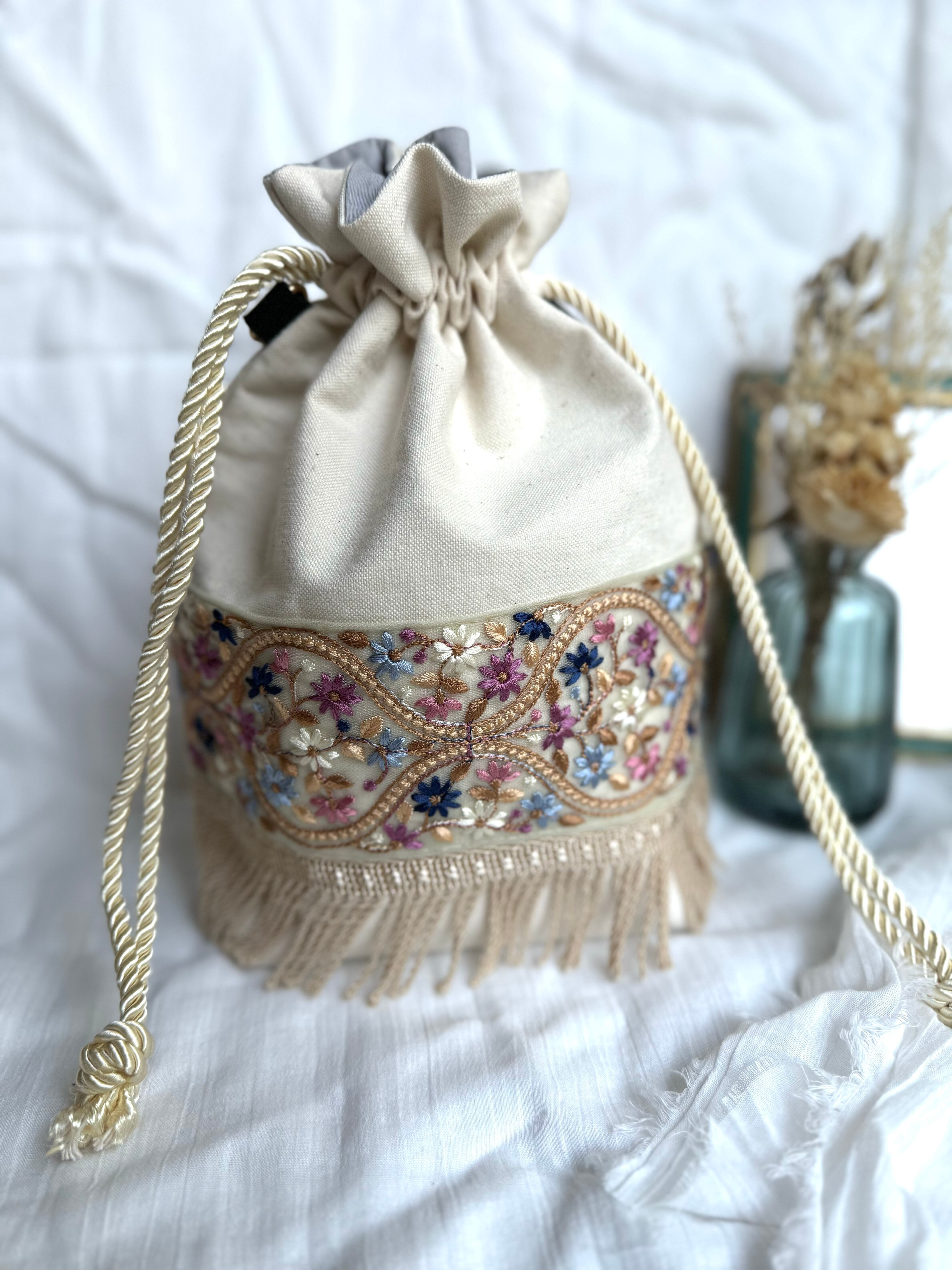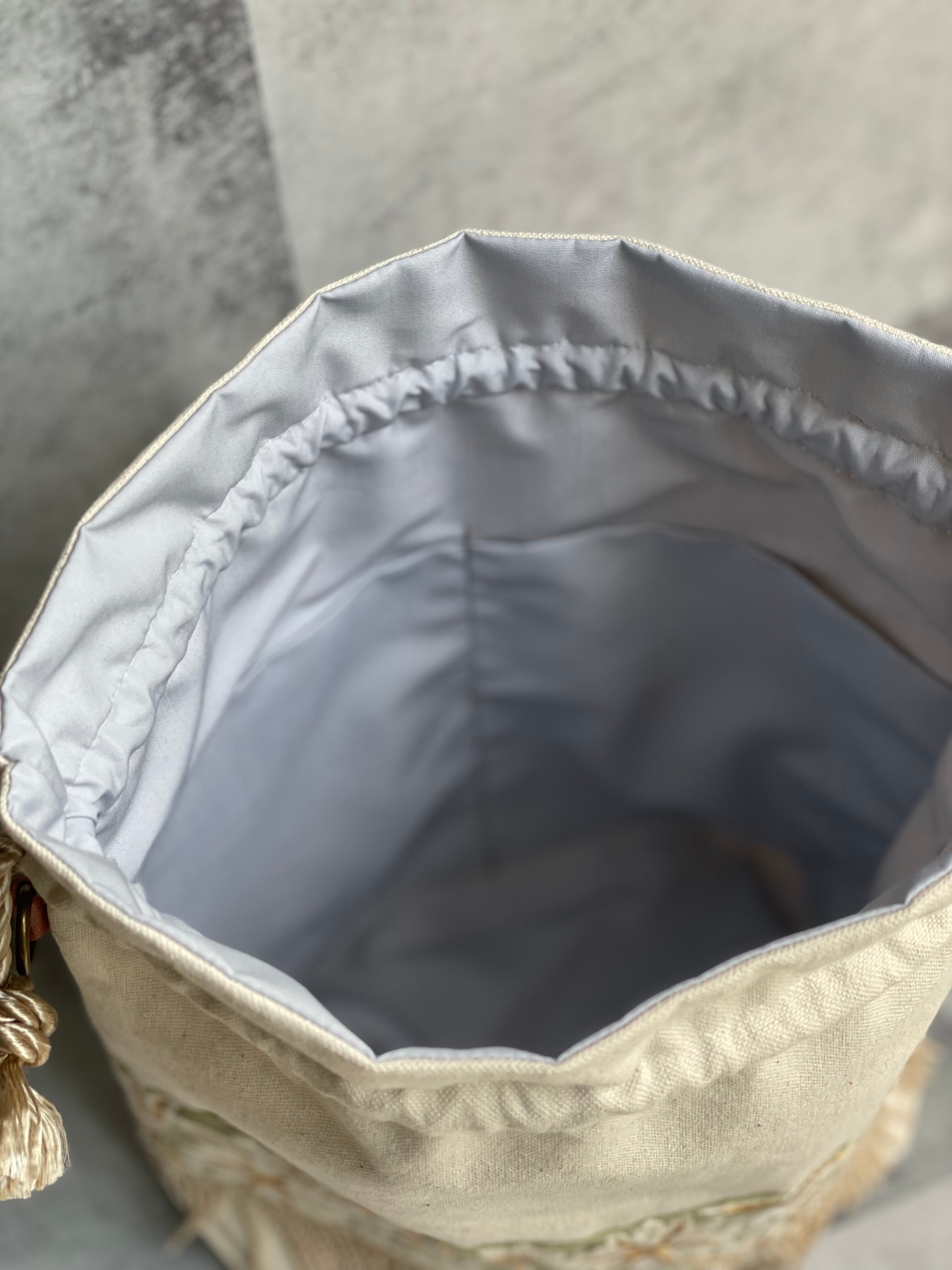 ◣華やかで目を引くインド刺繍リボンを使った巾着ショルダーバック◥