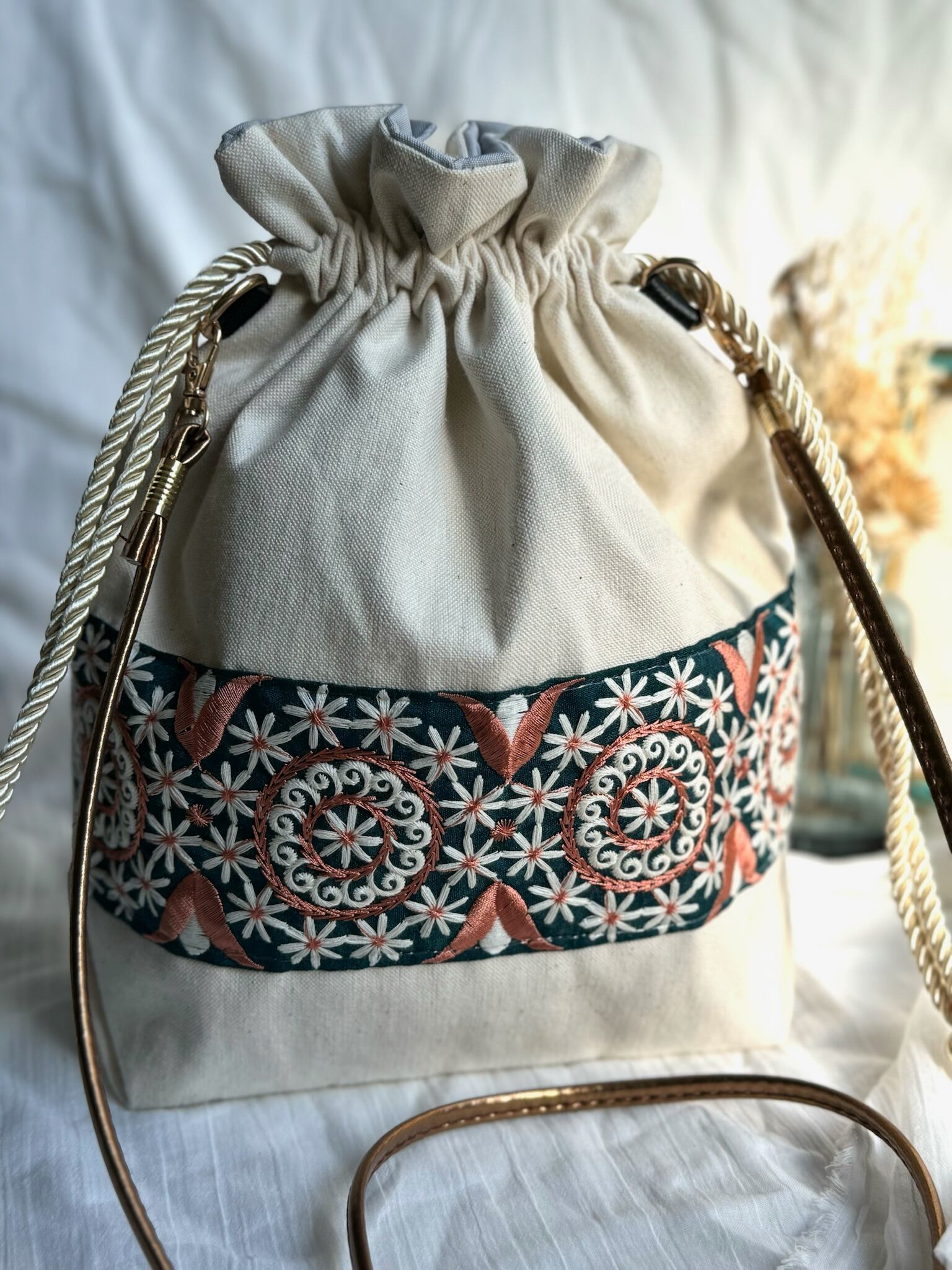 ◣華やかで目を引くインド刺繍リボンを使った巾着ショルダーバック◥